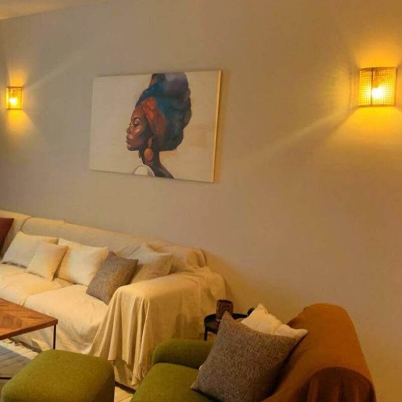 Un portrait artistique d’une femme africaine en profil, sublimée par un turban coloré et de grandes boucles dorées. Une œuvre moderne, raffinée et pleine de caractère, idéale pour une décoration chic et culturelle.