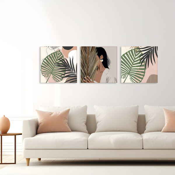 Table carrée blanche avec pieds en bois naturel intégrée dans un décor minimaliste lumineux, sans chaises, avec plantes décoratives.